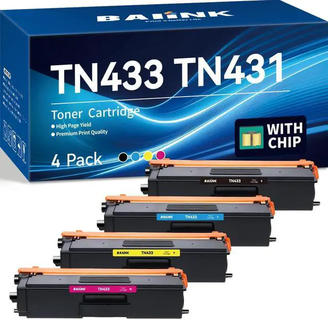Package Contents: 4 pack Replacement for Brother TN433 TN-433 TN431 TN-431 (1 x Black, 1 x Cyan, 1 x Magenta, 1 x Yellow)