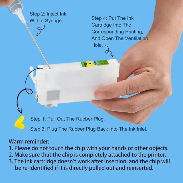 Suggestion: Empty ink cartridges can only contain 90% ink, so as to prevent the ink from overflowing and polluting the printer during use. And be sure to unplug the rubber plug of the ventilation hole during use.If your printer is brand new and you have not used the original ink cartridge, please first install the original ink cartridge and initialize the printer so that your new printer can recognize and use our ink cartridge. If you have any questions about this product, please feel free to contact us.