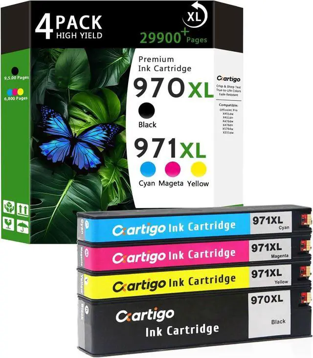 Package Contents: 4 Pack 970XL 971XL Ink Cartridges Replacement for HP 1x Black CN625AM, 1x Cyan CN622AM, 1x Magenta CN623AM, 1x Yellow CN624AM Ink (Non-OEM)