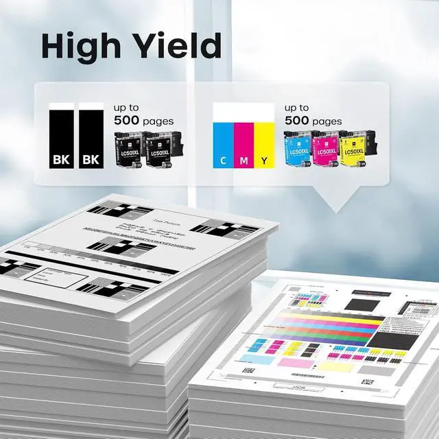 Page Yield: Up to 500 pages per LC501XL Black Ink Cartridge, up to 500 pages per LC501XL Color Ink Cartridges (5% coverage at A4 paper)