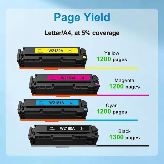 High Pages Yield: 218A black Toner cartridge can print up to 1,300 pages, 218A cyan Toner cartridge can print up to 1,200 pages, 218A magenta Toner cartridge can print up to 1,200 pages, 218A yellow Toner cartridge can print up to 1,200 pages(at 5% coverage).