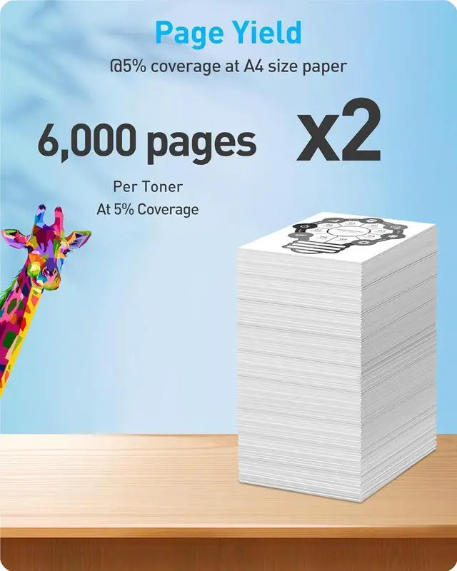 Page Yield: up to 6,000 pages per toner, @5% coverage at A4 size paper