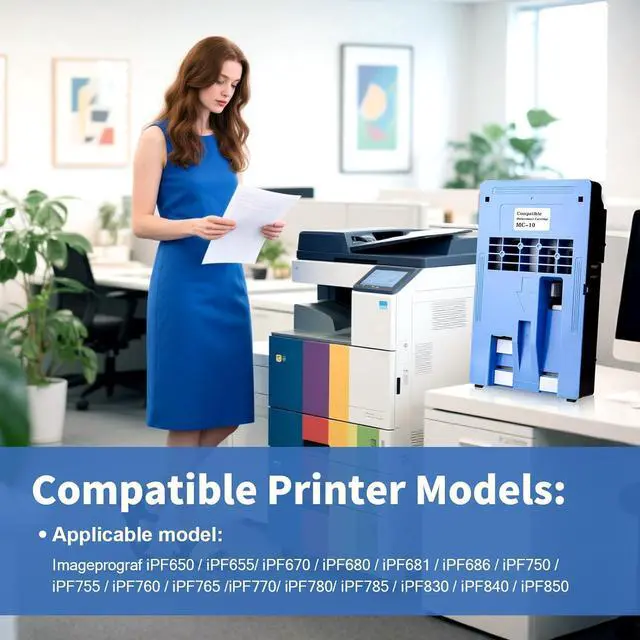 Compatible Printers: The MC-10 maintenance cartridge replacement works with Canon Imageprograf iPF650 / iPF655/ iPF670 / iPF680 / iPF681 / iPF686 / iPF750 / iPF755 / iPF760 / iPF765 /iPF770/ iPF780/ iPF785 / iPF 830 / iPF 840 / iPF 850 printers.