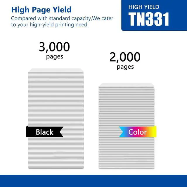 Print More, Spend Less: Each TN331 Black Toner cartridge offers a yield of 3,000 pages; Each TN331C/M/Y Toner cartridge offers a yield of 2,000 pages at 5% coverage (Letter/A4)