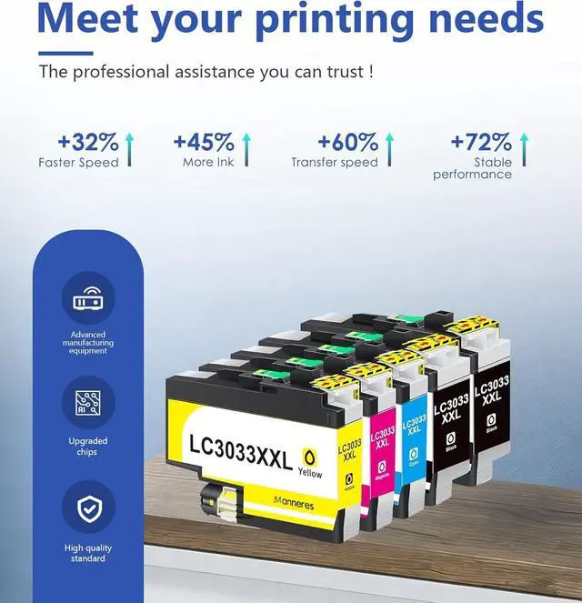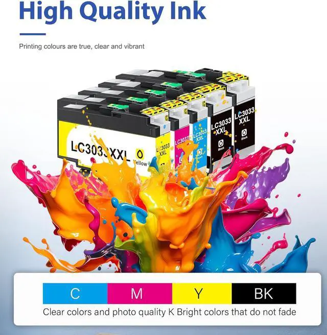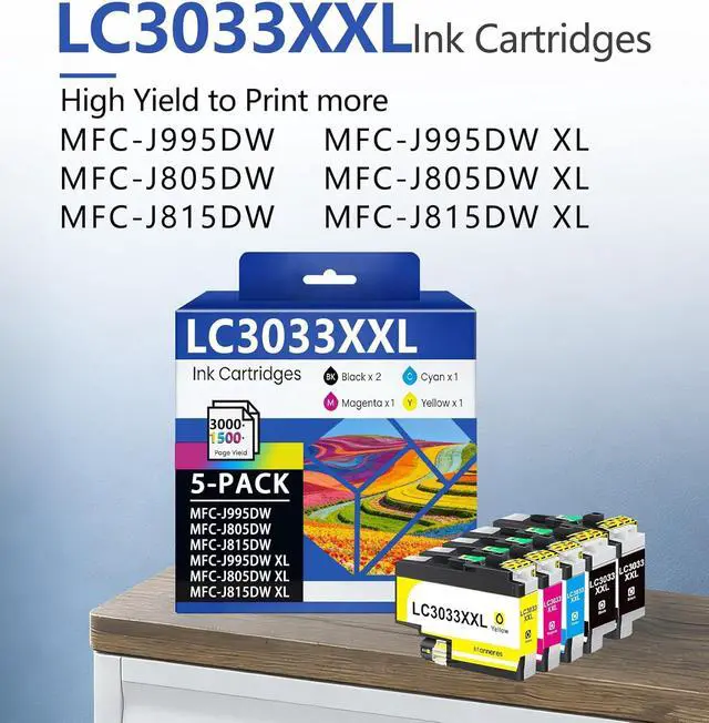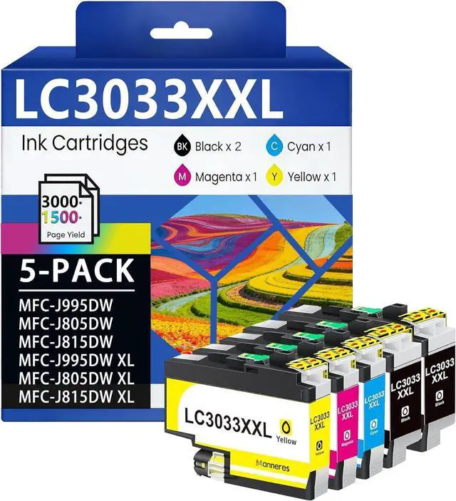 High-Capacity Ink Cartridge Pack: Contains 5 LC3033XXL cartridges (2Baclk, 1 Cyan, 1 Magenta, 1 Yellow). Individually sealed packaging prevents ink leakage