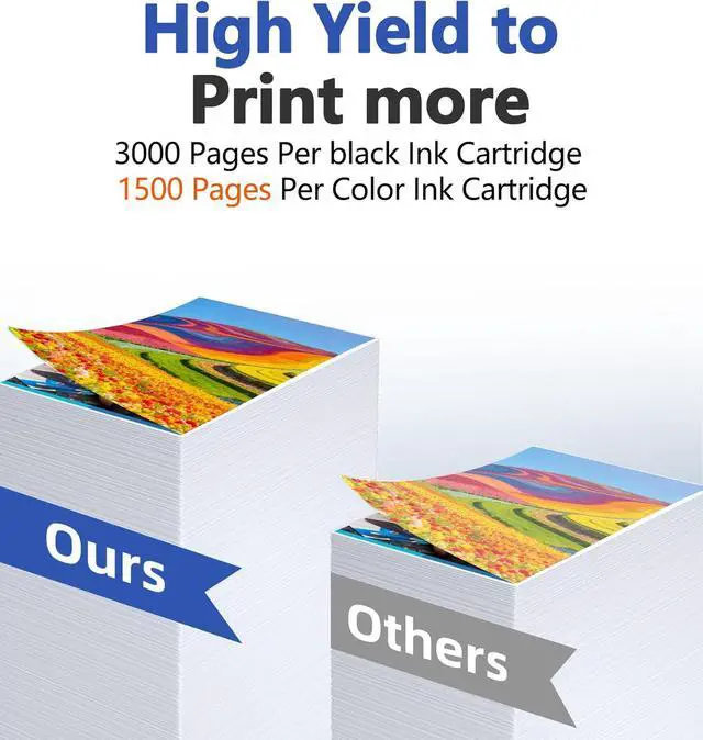 High Page Yield Less Refills: Black cartridges yield up to 3000 pages each color cartridge yields 1500 pages based on 5% A4 paper coverage Far exceeding standard capacity cartridges it minimizes frequent replacement hassle and meets daily document and high definition photo printing needs