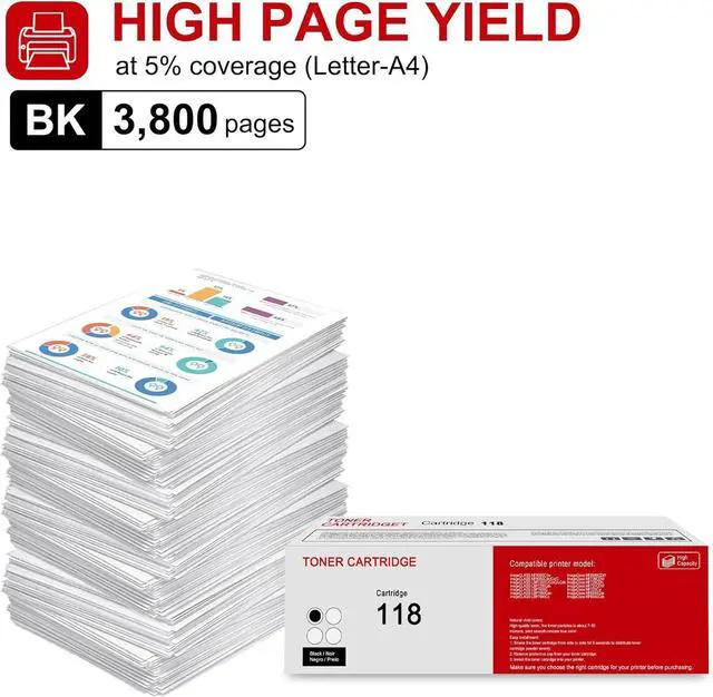 Page Yield: 3,800 pages per 118 Black Toner Cartridge at 5% coverage.