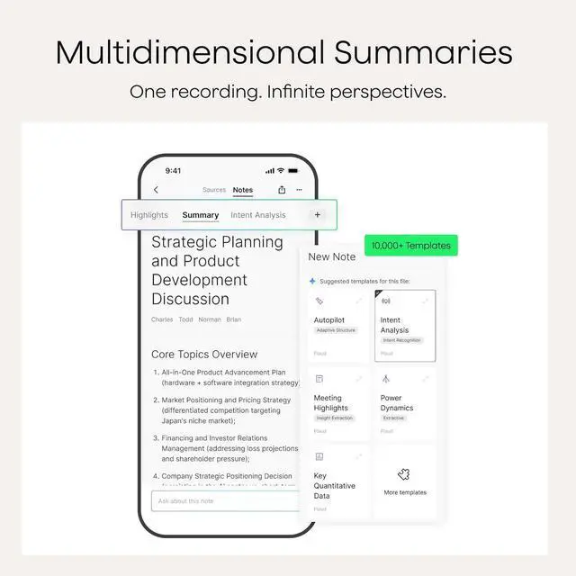 Multimodal Input & Multidimensional Summaries: Capture audio, type notes, add images, and press/tap to highlight for richer context with multimodal input. Press the record button to mark key moments in real time. Plaud transforms a single conversation into multiple perspectives, providing faster, clearer insights, and unifies these inputs to deliver role-specific summaries that reflect your intent and priorities