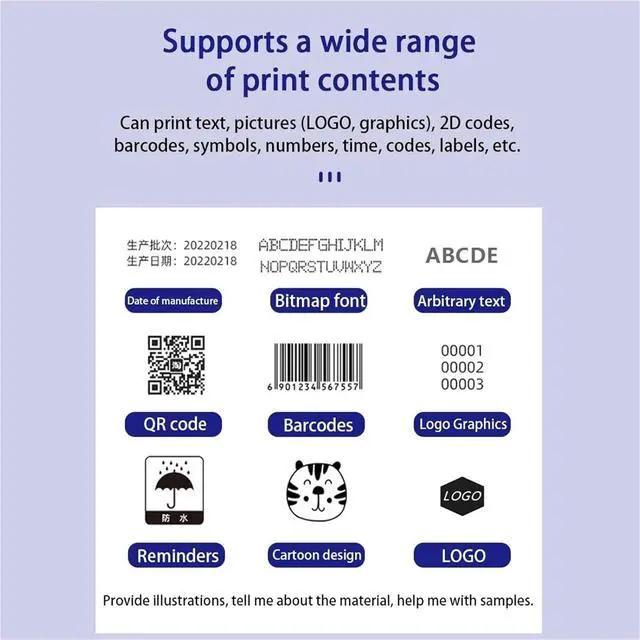 Print Content: Time, Date, Counter, QR code, Barcode, Logo, etc.