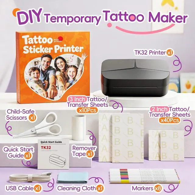 UPGRADE KIT: -1Temporary Tattoo Maker, 8 colorful markers, 50 tattoo papers (2 sizes), 50 transfer sheets (2 sizes), USB cable,1 Child-Safe Scissors,Cleaning Cloth,Remover Tape