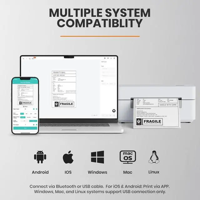Bluetooth & USB Connection: Bluetooth thermal label printer can connect to iOS, Android, tablets, and iPads via Bluetooth through a dedicated app, or to Windows, Mac, and Linux systems via USB. This flexible connection allows you to print easily from any device, whether at home or in the office.