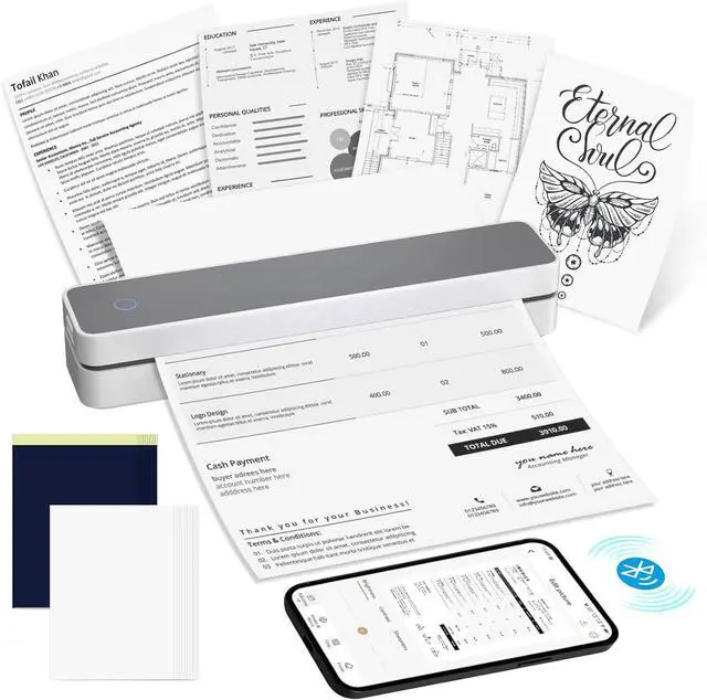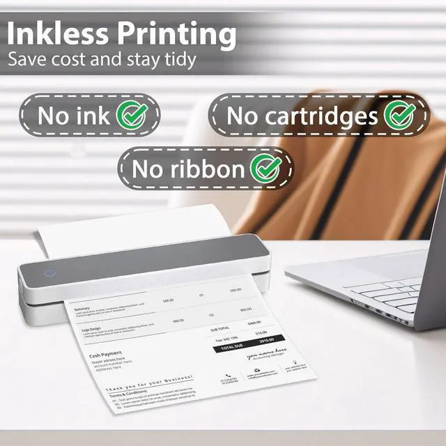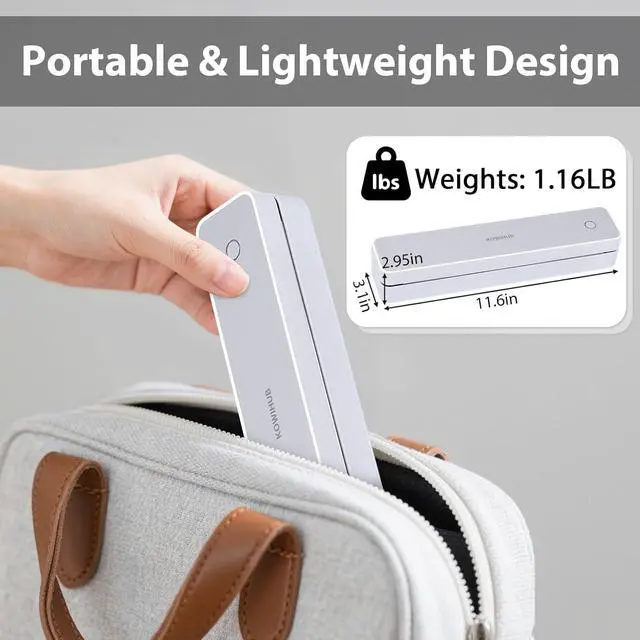 Portable & Lightweight Design: With a compact length, this thermal printer is perfect for carrying around, Inkless portable printer weighs only 1.16lb, with a compact size that fits easily into your backpack, Ideal for on-the-go printing during business travel, in car or truck, small office, construction site, school and home use