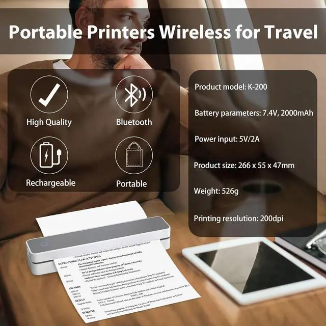 Long-Lasting Durable Battery: With a 2000mAh battery, our portable printers wireless for travel offers long-lasting power, With just one full charge, you can print up to 110 pages of light-colored images or text, This thermal printer consumes almost no power when standby, Even if you forget to charge it, this small printers for home use can be charged and printed via a USB cable