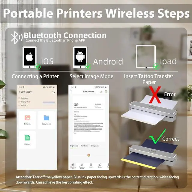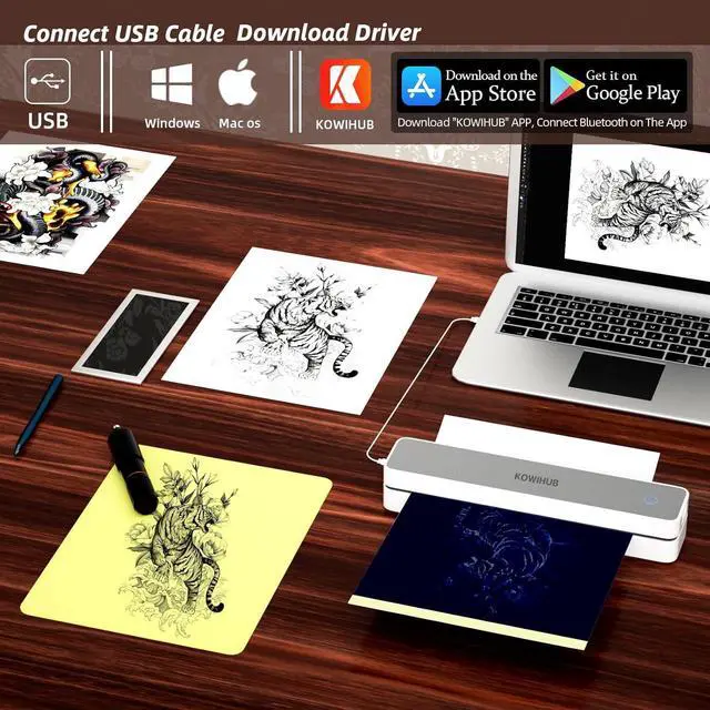 Inkless Printing: portable printer utilizes advanced inkless printer technology, print clear and precise patterns and lines, eliminates the hassle of replacing ink cartridges or carbon strips. This small printers for home use is not only able to print on regular thermal printer paper, is also able to be used as a tattoo stencil printer, saving on printing costs while maintaining high-resolution 200 dpi prints