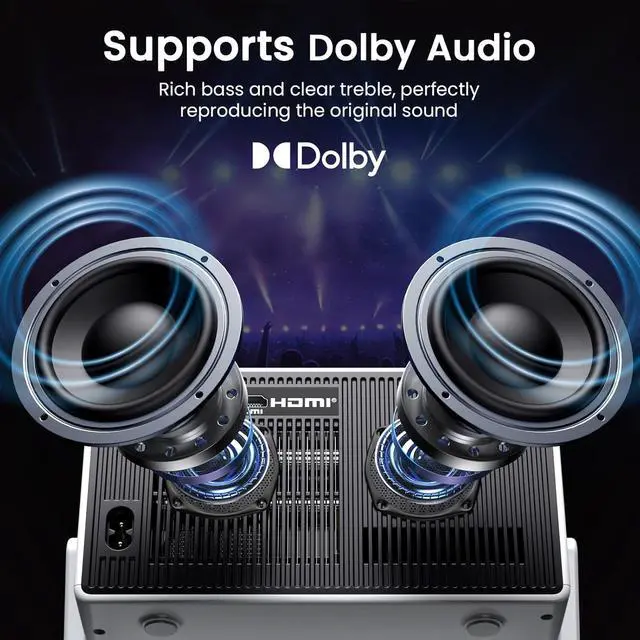 [Dolby Audio & 2×5W Speaker] The projector supports Dolby Audio and is equipped with powerful 2×5W built-in speakers, delivering clear dialogue, rich bass, and immersive, theater-like soundno external speakers required.