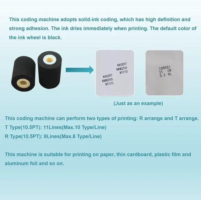 Printing Roller This coding machine is equipped with printing roller, which can perform two types of printing: R arrange and T arrange. The former type can print 1-8 lines with 1-8 characters in each line. The latter can print 1-10 lines with 1-10 characters in each line. We provide three size choices of 2mm, 2.5mm and 3mm.