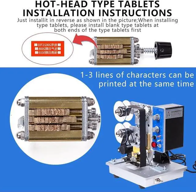 ADJUSTABLE TEMP&SPEEDAutomatic date code printer featuring 6 adjustable temperature levels, scope from 0 to 200, preheat for 5 to 10 min to start working;6 speed settings, the printing speed is 20 to 80 times per minute.