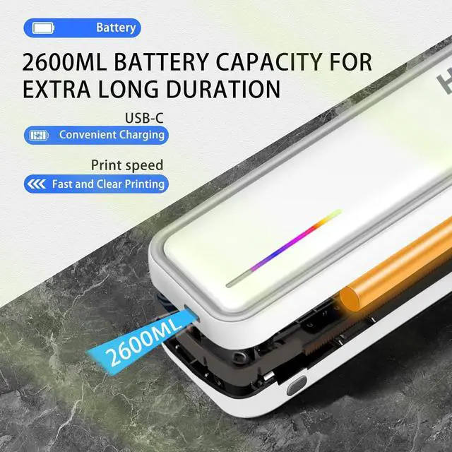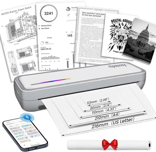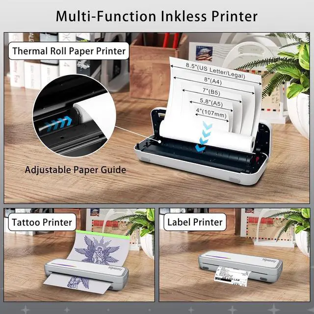 Anywhere PrintingThis portable Bluetooth thermal printer features a 2600mAh battery for 12 hours of continuous mobile use. Ideal for on-the-go printing (travel, office, home, car, outdoors), it handles office documents, contracts, invoices, receipts, delivery notes, boarding passes, engineering drawings, etc. Includes tattoo stencil printing capability with 5 sheets of specialty paper.
