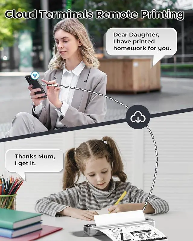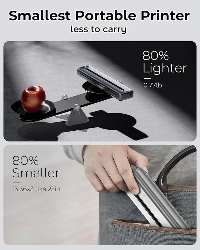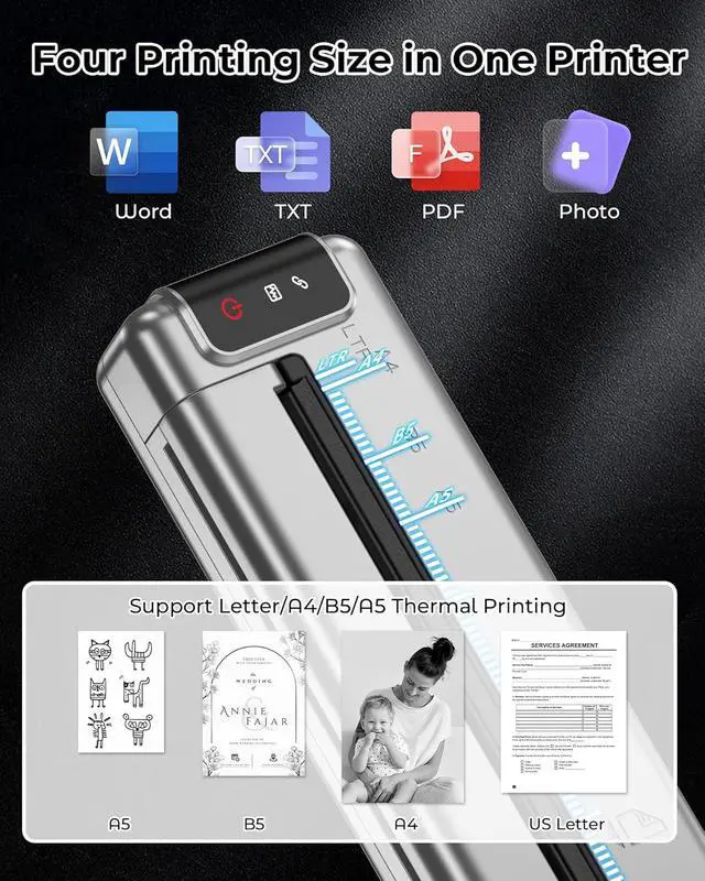 [Practical Inkless Portable Printer with Multi-size Printing]: Design with adjustable paper guide clip, you can print thermal paper or thermal labels within 8.5"/8"/7"/5.8" (US Letter/A4/B5/A5) width, widely application for documents, photos, greeting cards, address labels, clipart, etc.; (Only supports monochrome printing)