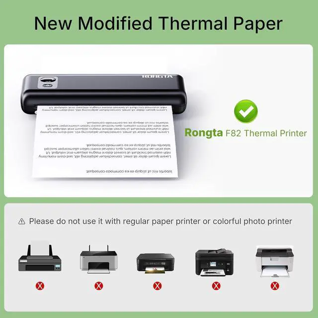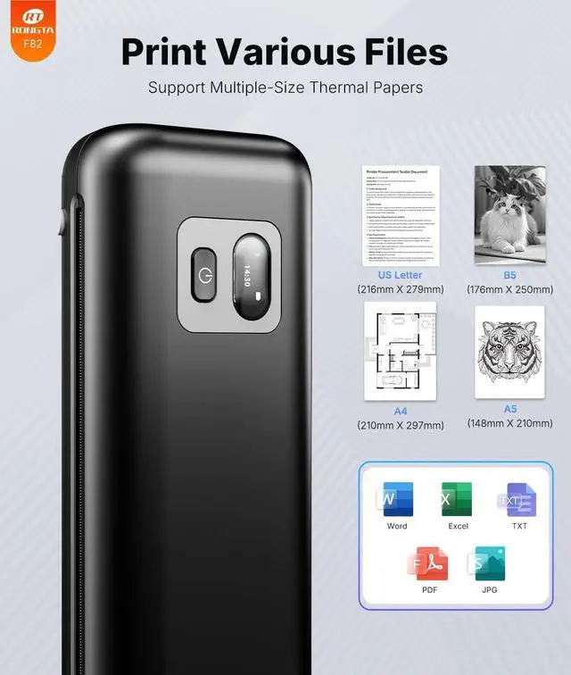 Advanced Inkless Thermal PrintingThe RONGTA F82 portable thermal printer uses cutting-edge inkless thermal technology, delivering high-speed, crisp, and clear prints in secondsno ink cartridges needed. Perfect for printing on US Letter, A4, A5 and B5 paper sizes, making it the ultimate inkless printer for home, office, or travel.