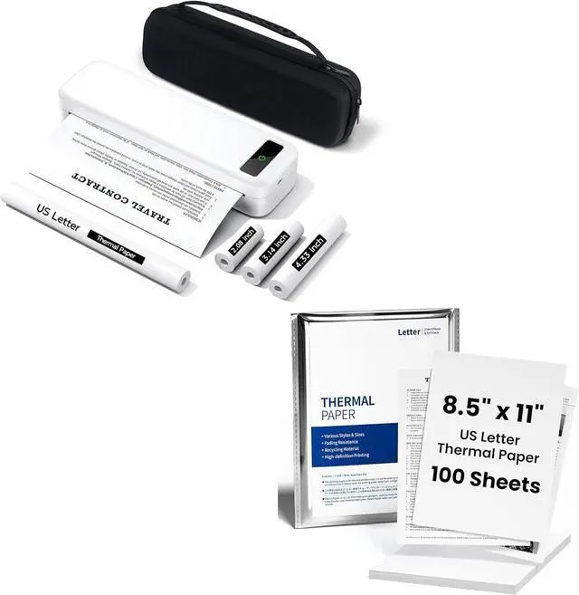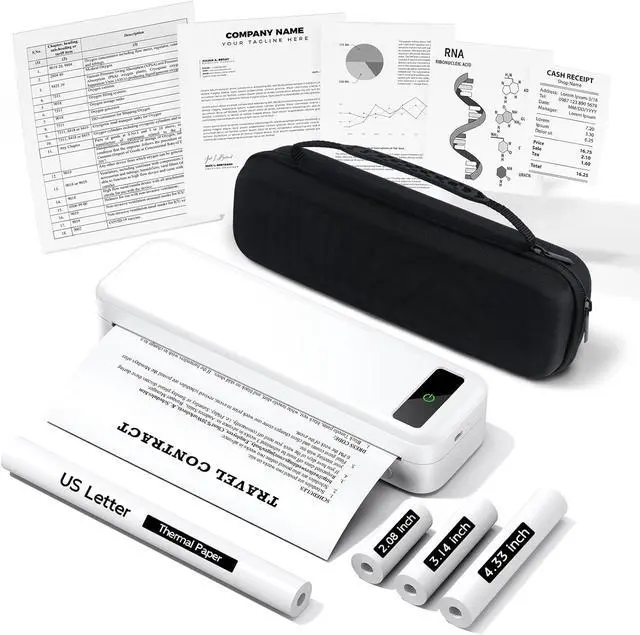 Portable Travel Printer with Carrying Case [Compact & Space-saving]: Inkless portable printer weighs only 1.5lb, built-in 2600mAh rechargeable battery, print 160 sheets of 8.5'' x 11'' thermal paper per charge. The package includes a thermal printer, a carrying case, 4 rolls of thermal paper (1 roll letter size thermal paper inside the printer & 4.33"/3.14"/2.08'' size), USB-C & USB-A cable, user guide. Ideal for on-the-go printing during business travel, in car or truck, small office