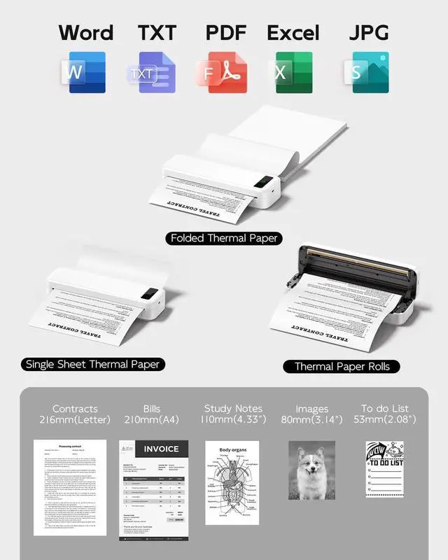 Thermal Printer [Multi-Size Printing]: The wireless portable printer with built-in paper bin, support thermal roll paper, folded and single sheet thermal paper. This small wireless printer also supports 5 sizes of thermal paper: 8.5 X 11 US Letter, A4, 4.33'' (110mm), 3.14'' (80mm), 2.08'' (53mm) width thermal paper, can meet most of your needs