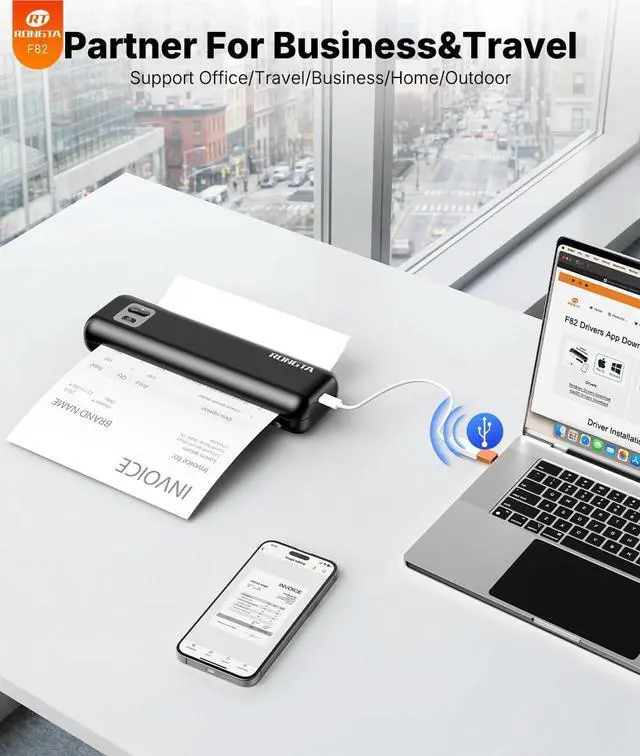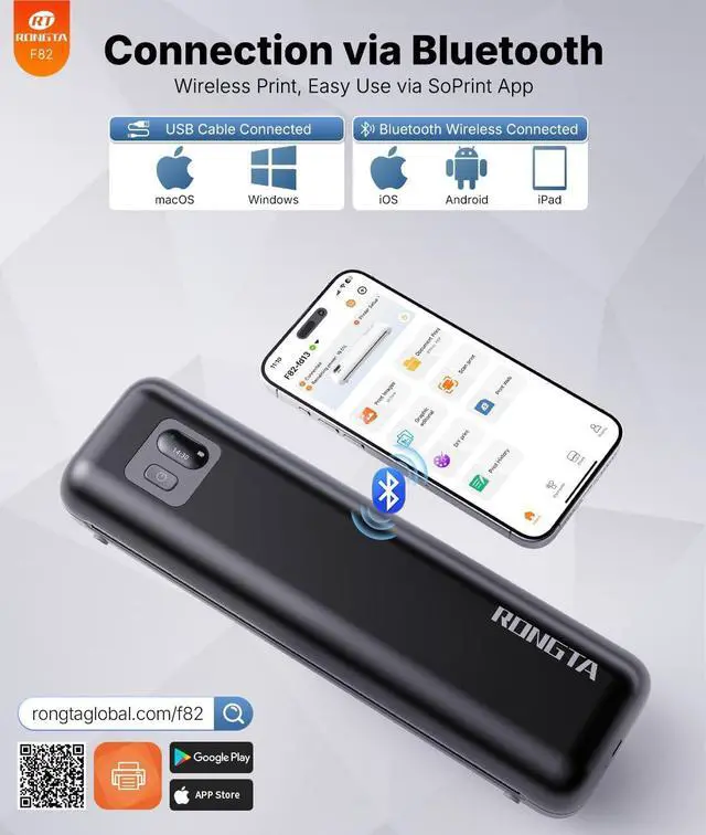 Connectivity & Wide Compatibility F82 has Bluetooth/USB Type C for seamless wireless/wired printing. Compatible with iPhone, iPad, Android Phone, Android Tablet, Laptop(Mac/Windows). "SoPrint" APP is free and can provide more creative printing experience to you, you can print in travel, vehicles anytime