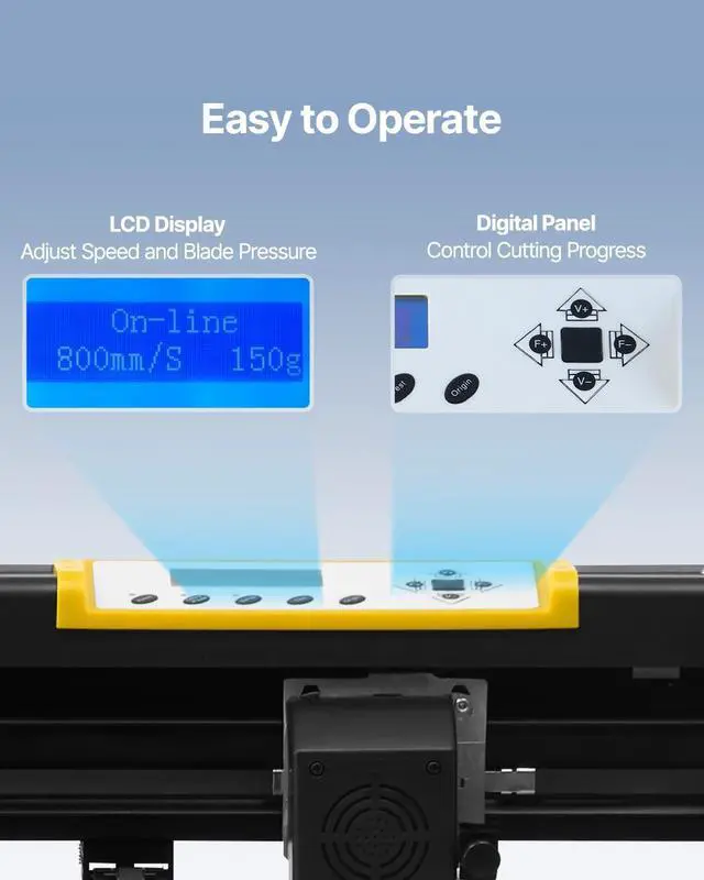 DIGITAL CONTROL PANEL- Come with the illuminated LCD screen and a large control panel, making sign-making easier. The vinyl printer features a cutting force of 500g and a speed of 800mm/s, providing precise cutting reliability.