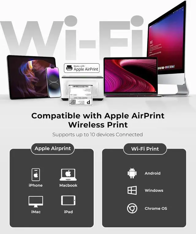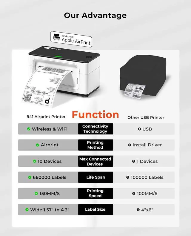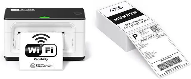 [AirPrint & Technology] 941AP wireless label printer uses AirPrint technology, perfectly compatible with Apple devices, iPhone, iPad and Mac, etc. Use AirPrint to one click easily print, without installing a driver (First use, you need to download "Munbyn Print" to configure network for printer on mobile phone.) Also compatible with Android, Windows, Chromebook and Linux.
