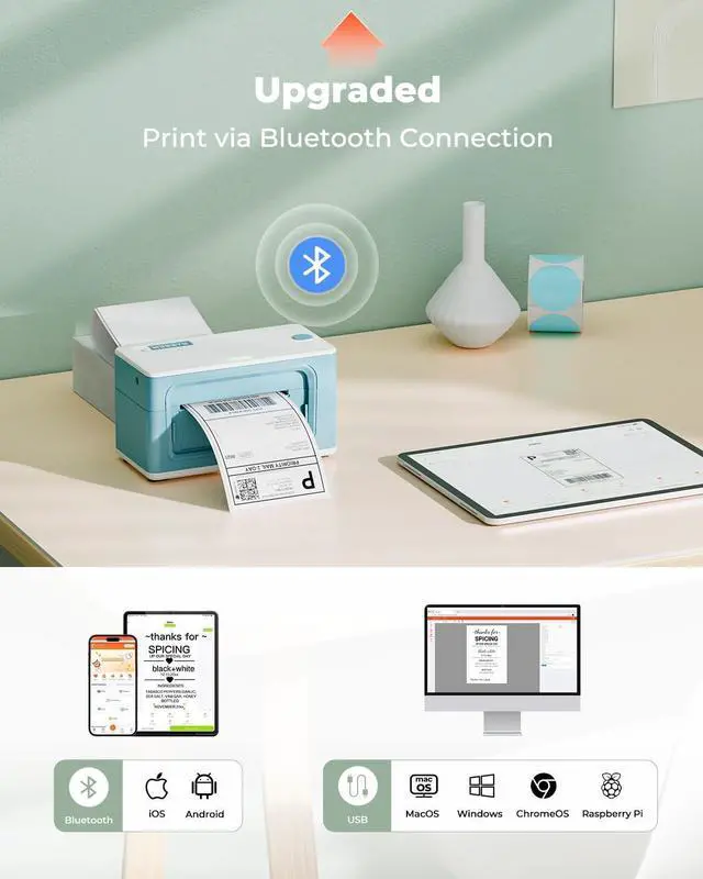 [Effortless Bluetooth Printing] MUNBYN RealWriter 941 Bluetooth upgraded label printer supports wireless printing via Bluetooth for iOS and Android devices. Easily download the "Munbyn Print" app from the App Store and start printing. For those who incline a wired connection, this thermal printer connects directly to your computer using a Type-C cable, compatible with macOS, Windows, and ChromeOS operating systems.