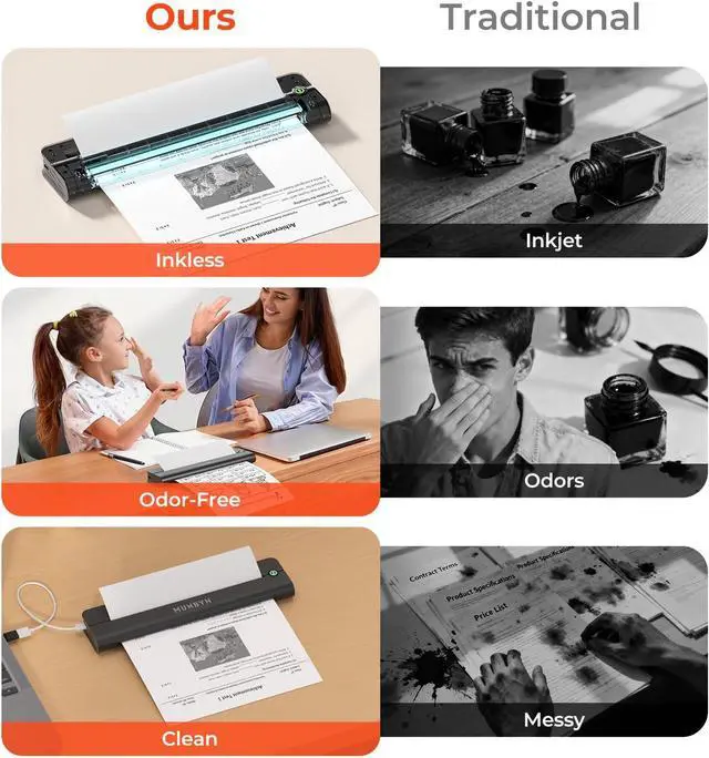 [Inkless Printing & Cost Effective] Adopting advanced thermal technology, this inkless printer requires no ink, toner, or ribbons. Simply replace the thermal paper to print.Only support black and white printingThis eliminates the frustration of clogged nozzles or dried-up ink cartridges common in traditional inkjet printerssay goodbye to dirty hands and expensive supplies.
