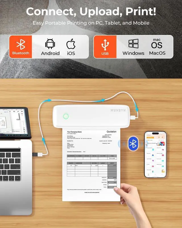 Device Adaptability: The thermal printer offers seamless connectivity options for various devices. It supports Bluetooth connection for both iOS and Android smartphones, and USB connection for Windows and Mac computers. Please note that when connecting to a computer, the included data cable must be used. Additionally, a USB-Type C adapter is required for Mac connections. And it is designed to handle multiple file formats, ensuring compatibility with Word, Excel, PPT, TXT, and JPG files.