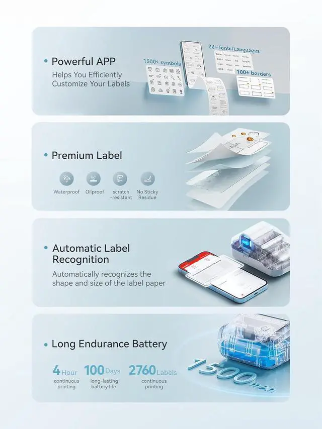 Powerful APP: The Versatile NIIMBOT app included more than support 10+ fonts/Languages, 100+ borders, and 1500+ symbols, barcodes, QR codes, icons, time, images,table and so on. Besides that, they are some pre-made templates in app, you can directly use or refer to them to design your own lables.