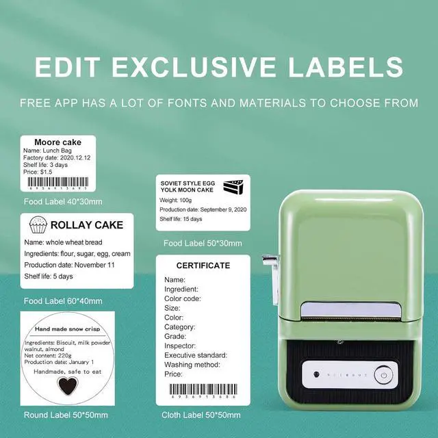 What You GetNIIMBOT B21 Green Label Maker +1 Roll 50*30mm White Tape+1 Roll 40*30mm Clear Tape