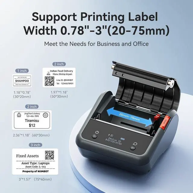 3 Inch Thermal Label Maker - With the thermal technology, no need to buy the ink, toner, and ribbon.NIIMBOT Portable business label printer support label width 0.8 to 3 inches (20mm-75mm).And printing wider and more types of labels: such as barcode, jars, price tag, clothes label, QR, address labels, product ingredient labels etc...