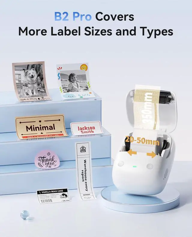 • Cover More Label Sizes & Type This B2 PRO label printer supports a print width range of 0.78'' - 1.96'' (20 - 50mm) and a print length range of 0.3'' - 13'' (8 - 350mm). It is compatible with multiple paper types, including standard thermal label paper, photo paper, and two-color (red & black) ther