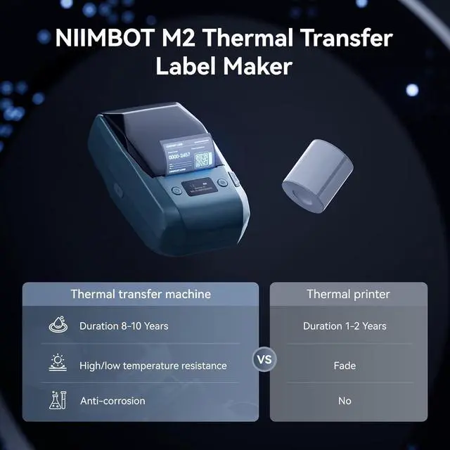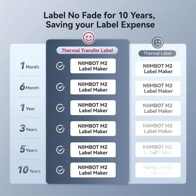 NIIMBOT M2 Label MakerNIIMBOT M2 bluetooth label printer adopts thermal transfer upgrade technology. Different with thermal printers, the labels that print with the M2 label maker machine can be stored longer for 8-10 years, not only waterproof, oil-proof, and scratch-resistant, but also chemical resistance, can withstand high and low temperatures(-4°F-248°F), solving the limitation of short storage time of thermal labels.
