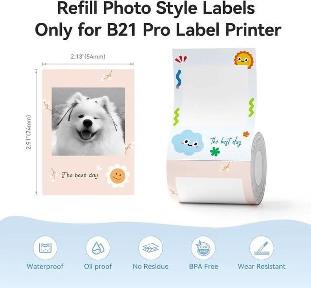 What You Will Get: 1 B21 Pro Label Maker+2 Refill Labels (includes 1 roll of 50x30mm white label paper pre-loaded + 1 "Best Day" style photo label roll)