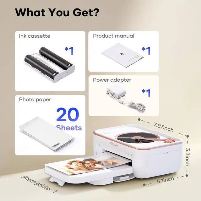 What You Get - 1x Desktop photo printer, 20 sheets 4x6 inch photo paper, 1 ribbon, printer cable with power adapter and product manual. We advocate consulting the product's instructional manual prior to initial use to elevate your overall user experience