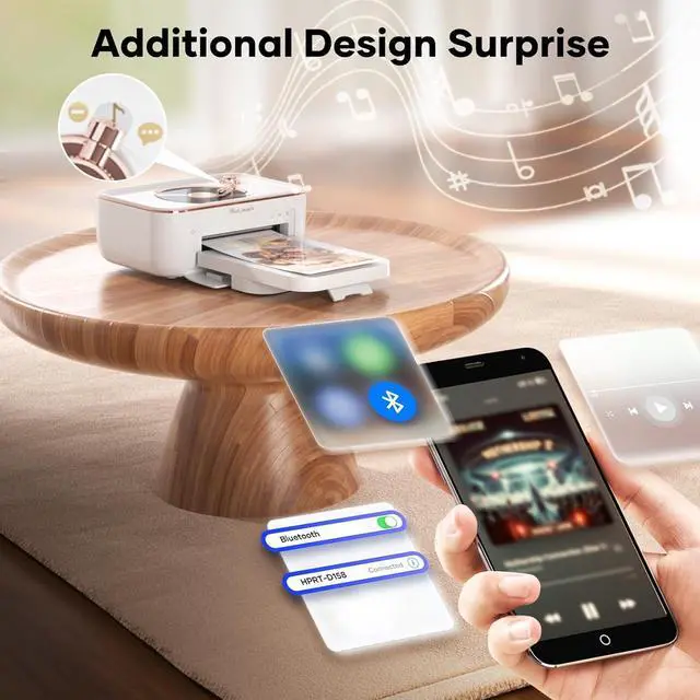 Multiple Additional Functions - More than just an exceptional photo printerits also a versatile Bluetooth speaker. With seamless one-tap Bluetooth connectivity directly from your smartphone (no app required), it transforms effortlessly from a printing hub to an audio companion. Simply glide the intuitive slider to start playing music