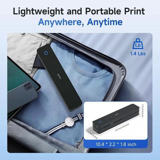 Ultra-Portable Design - The iDPRT portable thermal printer features a streamlined design, compact size, weighing only 1.4 pounds and measuring just 10.4 x 2.2 x 1.8 inches, making it easy to carry in your backpack, tote bag or briefcase, perfect for long commute times. Our portable document printer is a solid choice for anyone needing a reliable, portable printing solution. Great concept for on-go printing from anywhere needed, like if traveling for photos, work, business, office, home, car, or university.It great for business travelers, students, and remote workers.