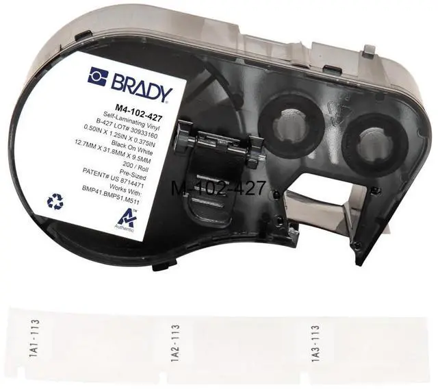 Brady Authentic (M4-102-427) Self-Laminating Vinyl Wrap Around Labels 1.25" H x 0.5" W Black on White, Clear, 200 Labels. for use with The BMP41, BMP51, and M511 Label Printers