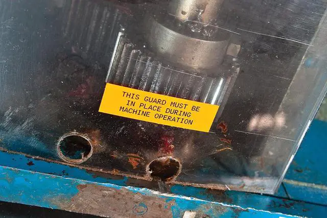 Prints on yellow vinyl background with a clean gloss finish that is resistant to exposure to chemicals, grease, oil, and cleaning agents.