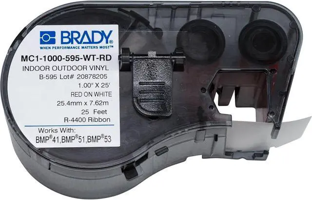 Label cartridge for Brady BMP51 and BMP53 portable printers (sold separately) Suitable for workplace labels, pipe markers, and warning signs Made of high-gloss vinyl film with a permanent acrylic adhesive Durable and flexible