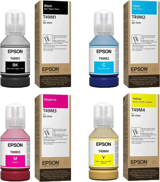 Epson Dye-Sublimation refill Inks for Epson SureColor F570 printers. 140ml bottles of Black, Cyan, Magenta, Yellow - T49M. High-efficiency ink formulated to achieve dramatic color intensity and high color contrast. Ink bottles feature exclusive auto-stop technology, for easy and mess-free ink refilling.