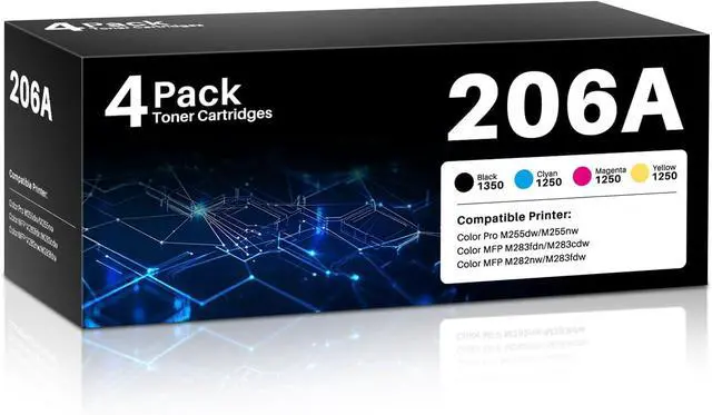 Product Name: 206A Toner Cartridges 4 Pack compatible for HP 206A, 206X, hp206a toner cartridges for HP Color LaserJet Pro MFP M283fdw ink cartridges, Color LaserJet Pro MFP M283cdw toner cartridges, Color LaserJet Pro M255dw toner cartridges, Color LaserJet Pro MFP M283fdn toner cartridges, Color LaserJet Pro MFP M282nw toner cartridges, Color LaserJet Pro M255nw toner cartridges