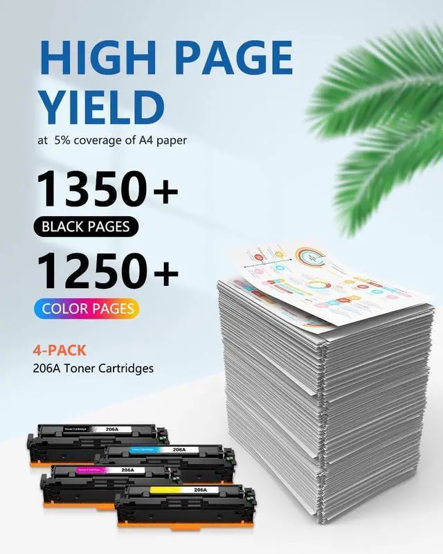 Page Yield:1,350 Pages for 206A Black Toner Cartridges, 1,250 Pages for 206A Color Toner Cartridges (Letter/A4, at 5% Coverage)