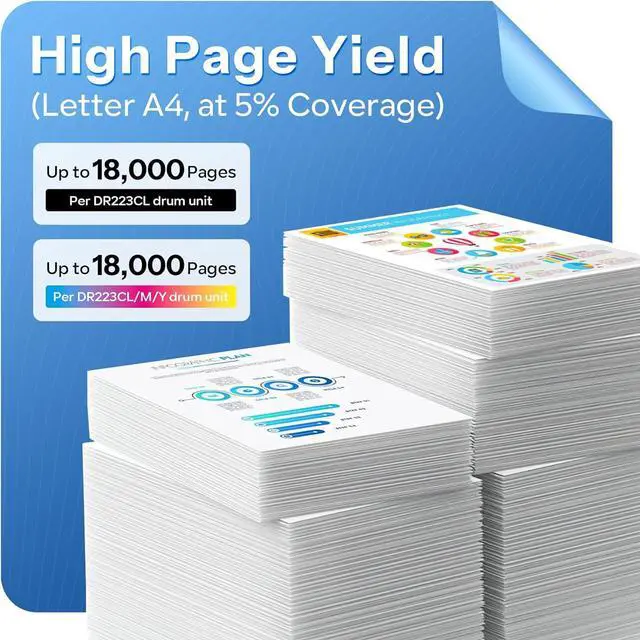 The page yield of each DR223CL DR-223CL Drum Unit BK/C/M/Y is 18000 pages. (Based on up to 15% coverage).