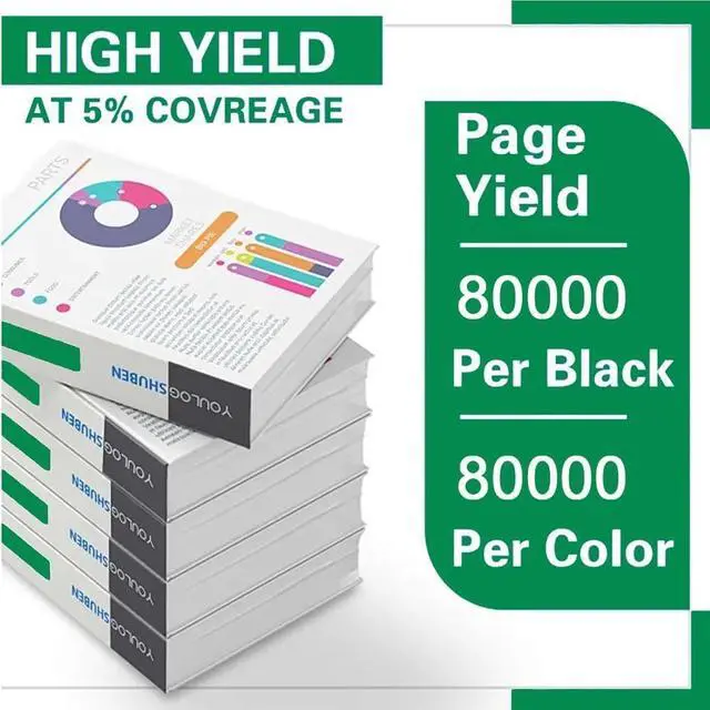 ESTIMATED PAGE YIELD - Black is about 80000 pages,Yellow Magenta Cyan is about 80000 pages (A4 paper 5% coverage),The number of pages printed is based on factors such as: consumable change intervals, paper loading intervals, speed and typical customer usage.