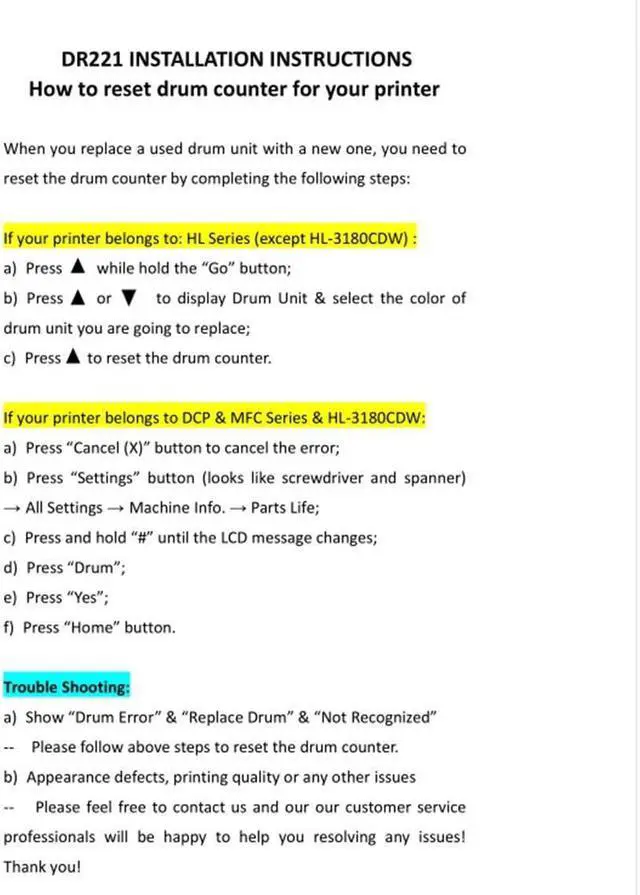 For LCD screen printers like: HL-3140CWHL-3150CDNHL-3170CDW, please reset the printer counter through the following instructions: Note1